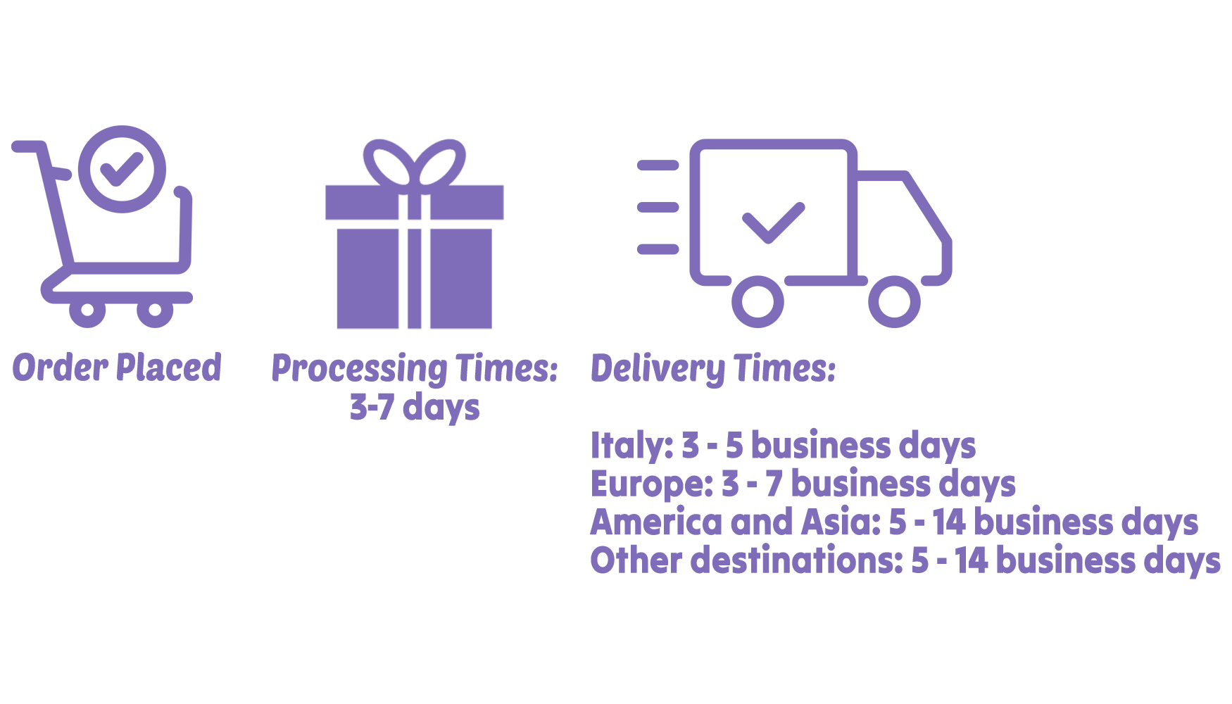Queste tempistiche sono stime. Potrebbero verificarsi ritardi dovuti a condizioni meteorologiche, ispezioni doganali o altri fattori fuori dal nostro controllo. Grazie per la pazienza e la comprensione!